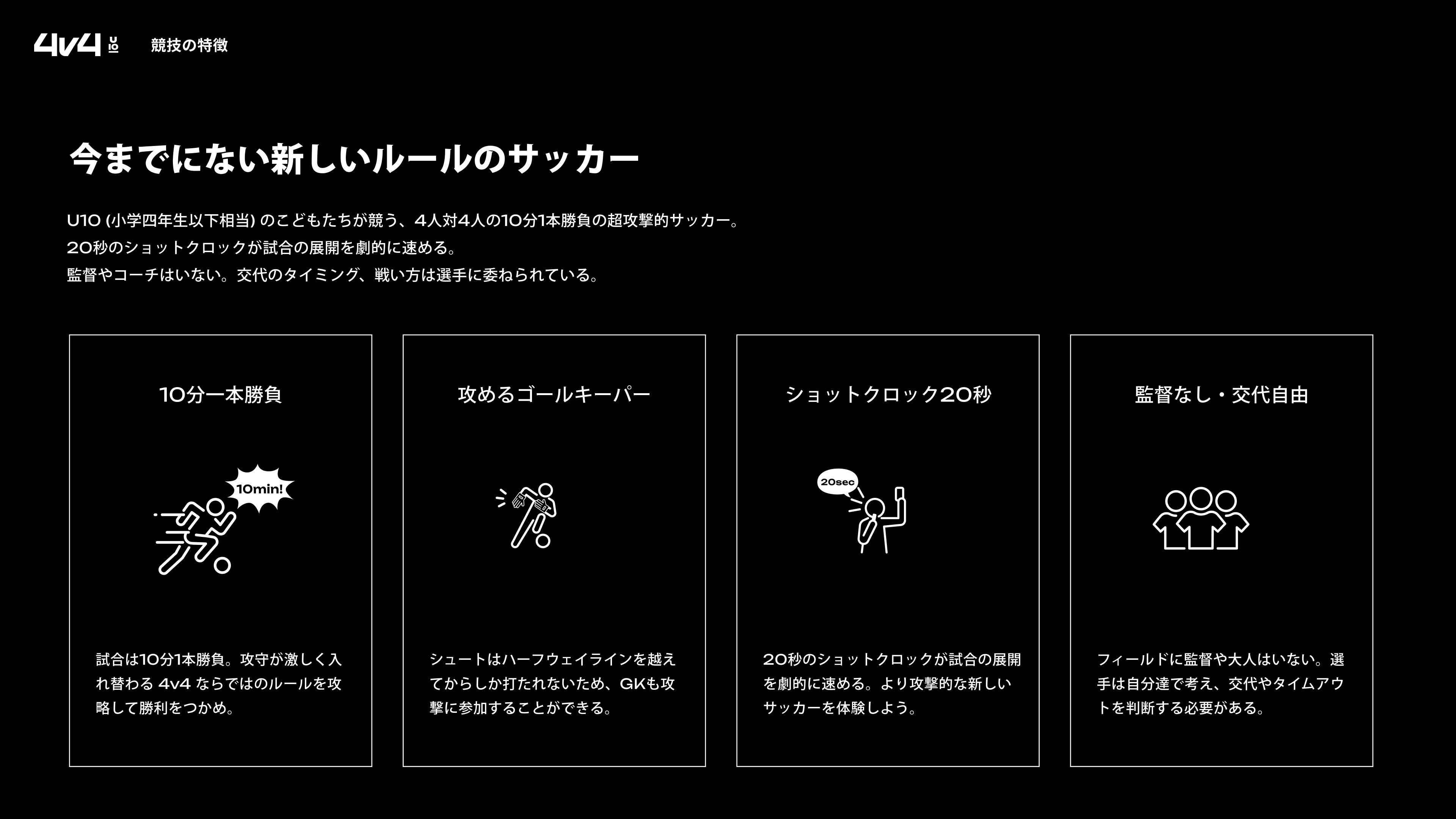 「4v4」とは日本のサッカー界をさらに盛り上げるべく、プロサッカー選手・本田圭佑がルールを考案した、4対4で行う新しいサッカー全国大会です。本大会は「サッカーの世界大会を全ての子どもに」というミッションのもと、育成年代の10歳以下の子どもを対象にした競技です。