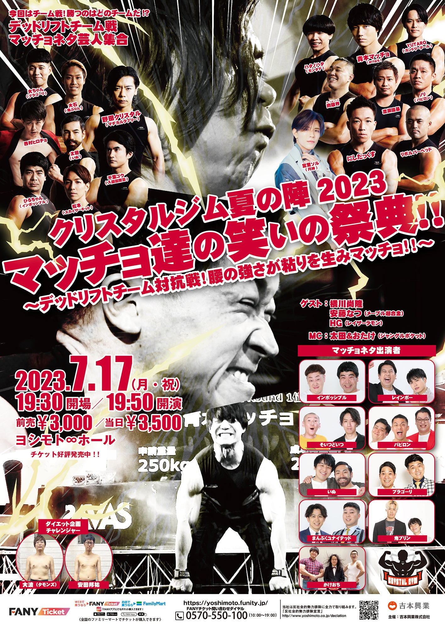 このたび、吉本興業所属のマヂカルラブリー野田クリスタルが発案し立ち上げた「クリスタルジム」が、オープンから約2年が経過しました。今回はジムのオープンを記念した『クリスタルジム夏の陣2023マッチョ達の笑いの祭典!!~デッドリフトチーム対抗戦!腰の強さが粘りを生みマッチョ!!~』を開催いたします。