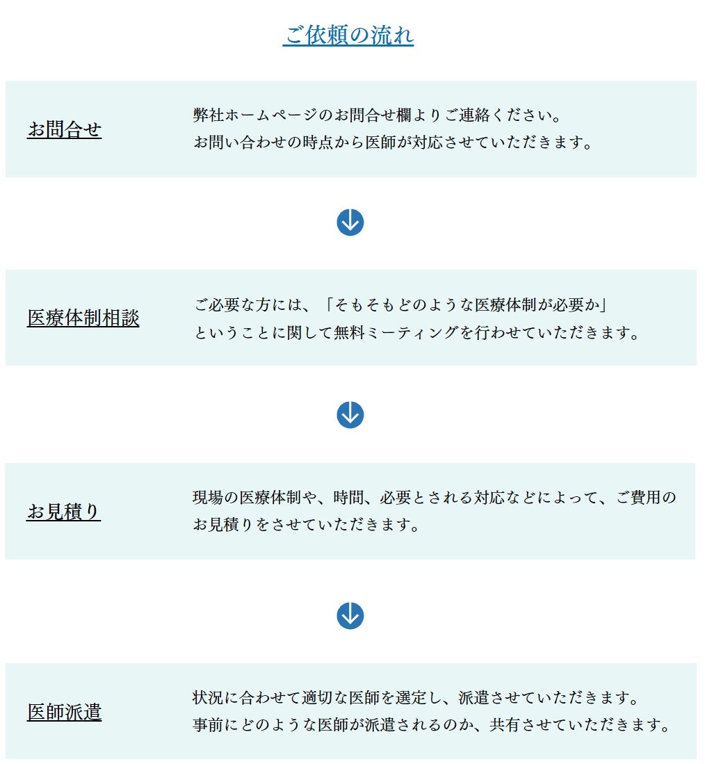 そんな中で、弊社の医師派遣サービスでは①医療体制の構築からサポートし、②他社様より安価での医師派遣が可能となっております。