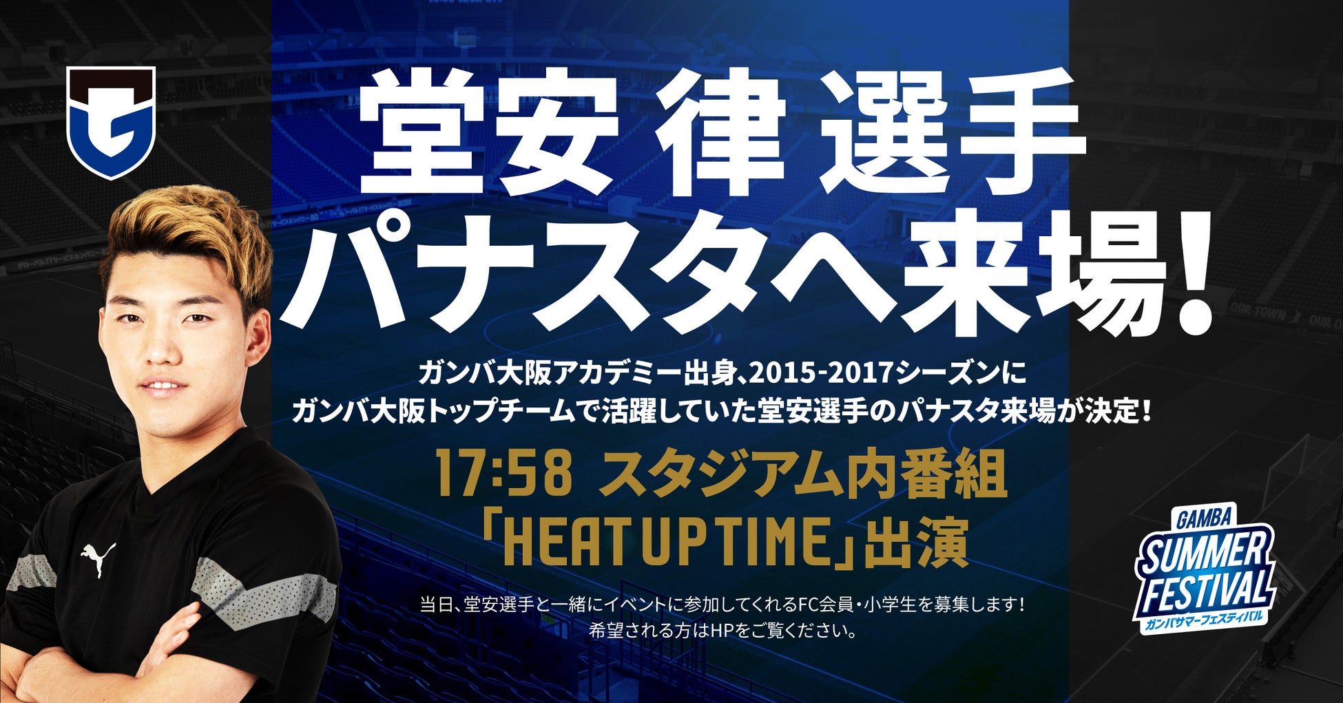堂安選手にはスタジアム内番組「HEAT UP TIME」へ出演頂き、ガンバ大阪のファン・サポーターの皆様へ挨拶をしていただきます。また番組内では堂安選手にも参加いただき、ファンクラブ会員の小学生と一緒にゲーム&質問コーナーを実施致します。なお、『HEAT UP TIME』はガンバ大阪公式YouTubeでご覧いただけます。