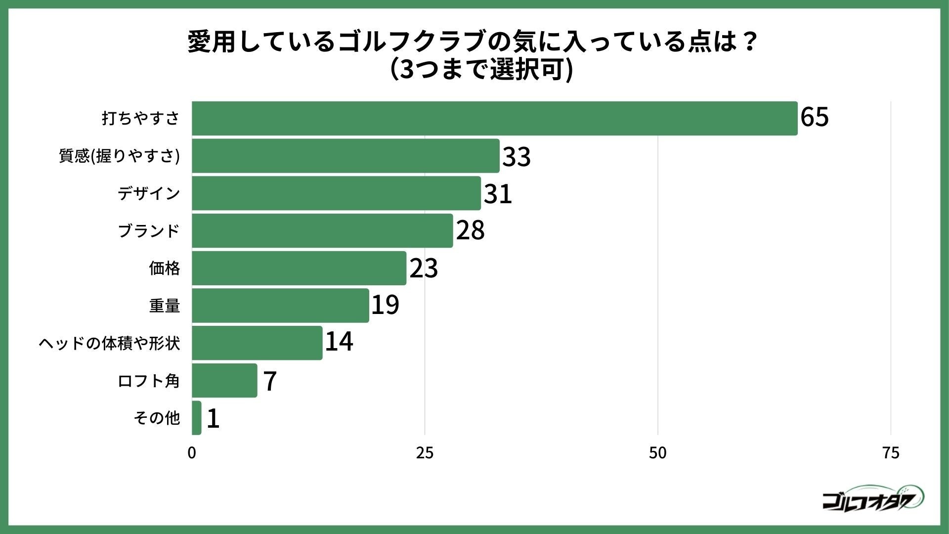 愛用しているゴルフクラブの気に入っている点では、「打ちやすさ」が65票とダントツの1位。2位、3位には「質感・握りやすさ」(33票)、デザイン(31票)がランクインしました。