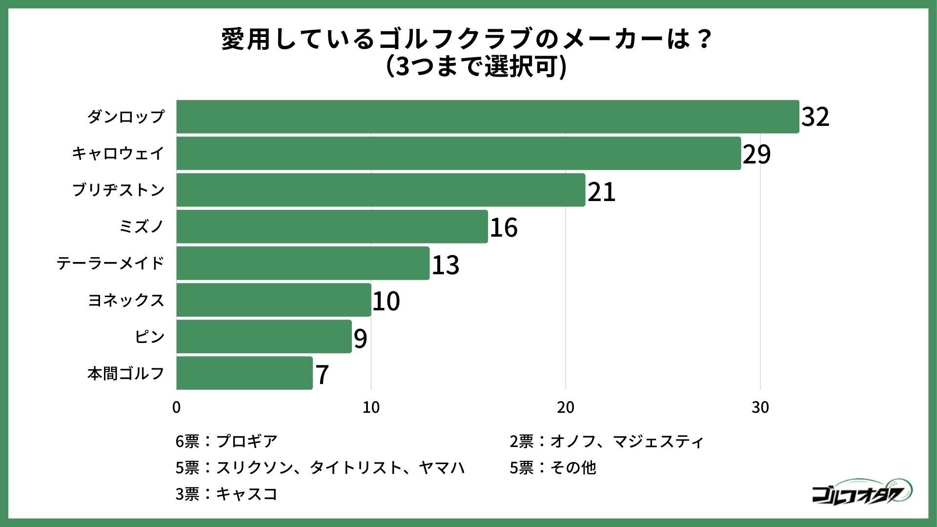 愛用しているゴルフクラブのメーカーでは「ダンロップ」が32票で1位。2位、3位には「キャロウェイ」(29票)、「ブリヂストン」(21票)がランクインしました。