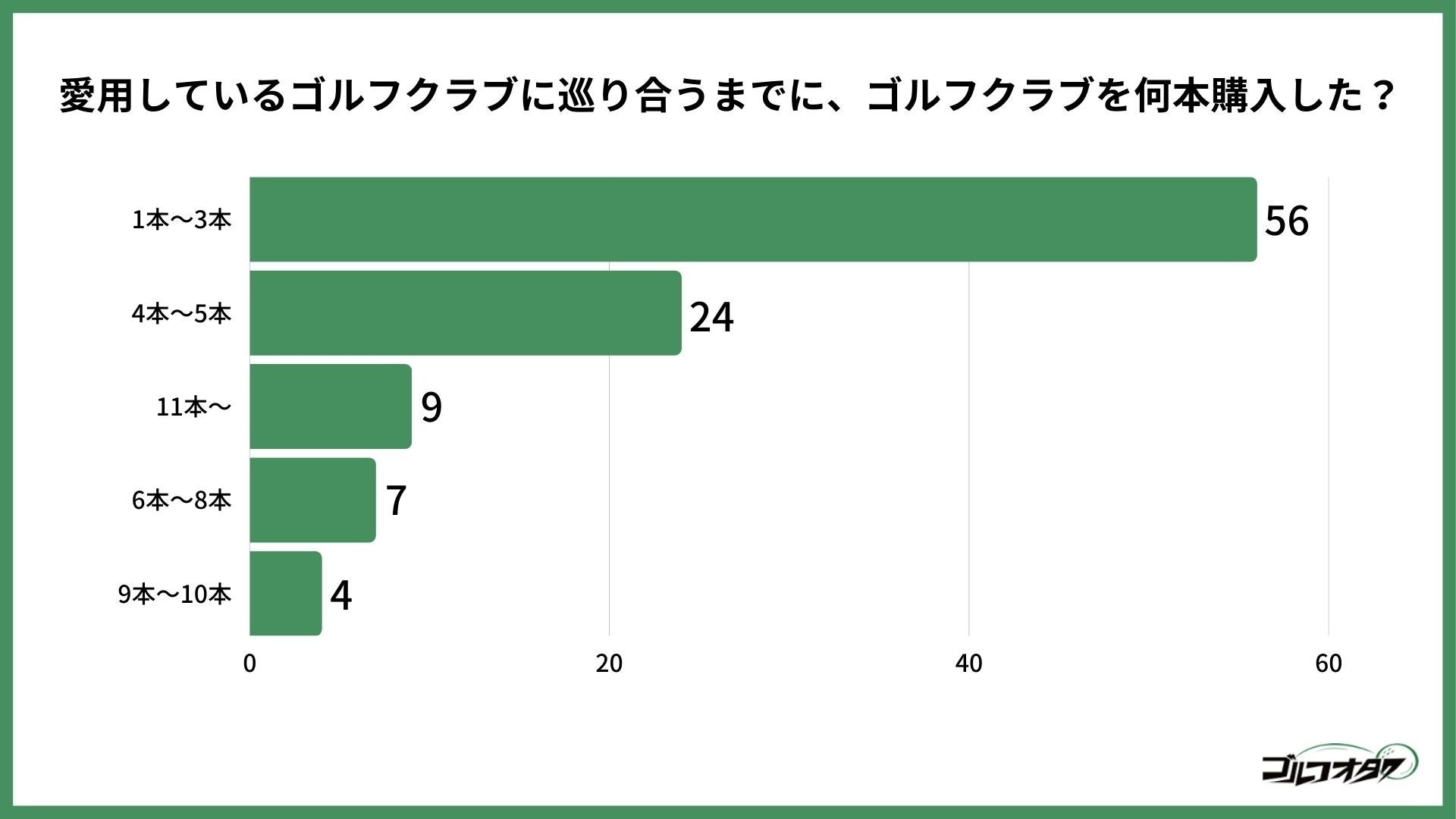 また、愛用しているゴルフクラブに巡り合うまでにゴルフクラブを購入した本数では、約45%の方が4本以上購入したと回答しています。お気に入りのゴルフクラブを見つけるのは容易ではないことが感じられます。
