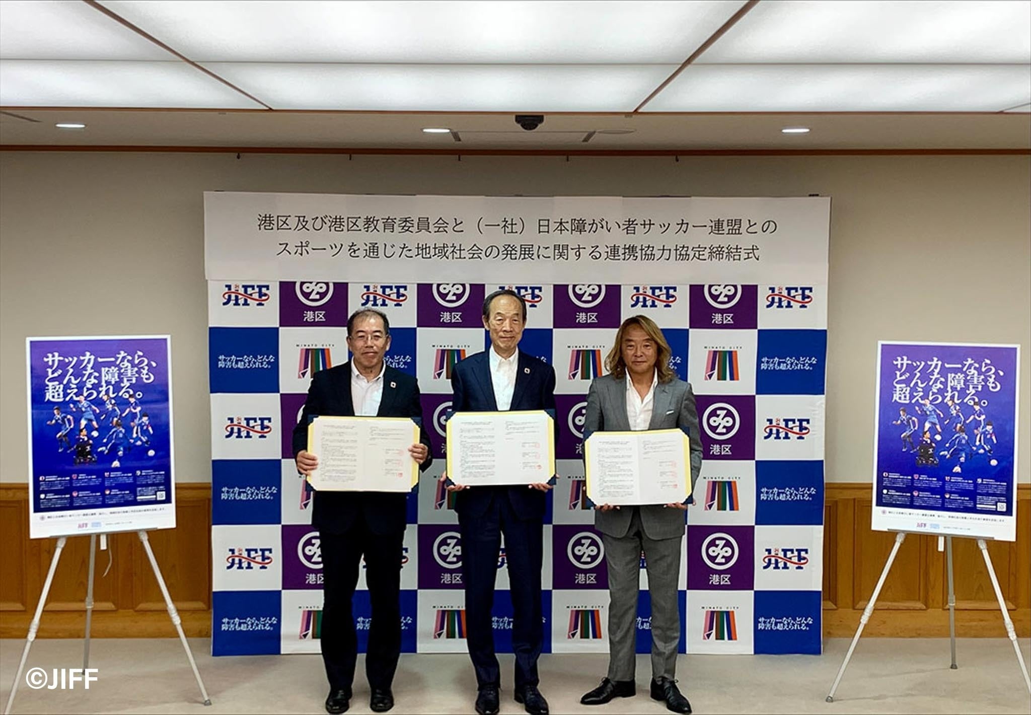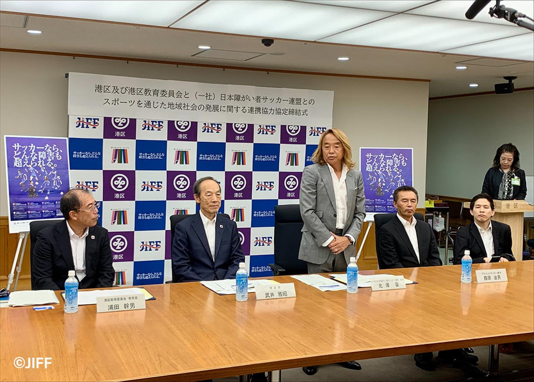 締結式は同日14時から開催され、武井雅昭港区長、浦田幹男港区教育委員会教育長、JIFF北澤会長のほか、区内で活動するブラインドサッカーチームから葭原滋男選手、区内在勤の電動車椅子サッカー三上勇輝選手が登壇しました。各者のコメントは次の通りです。