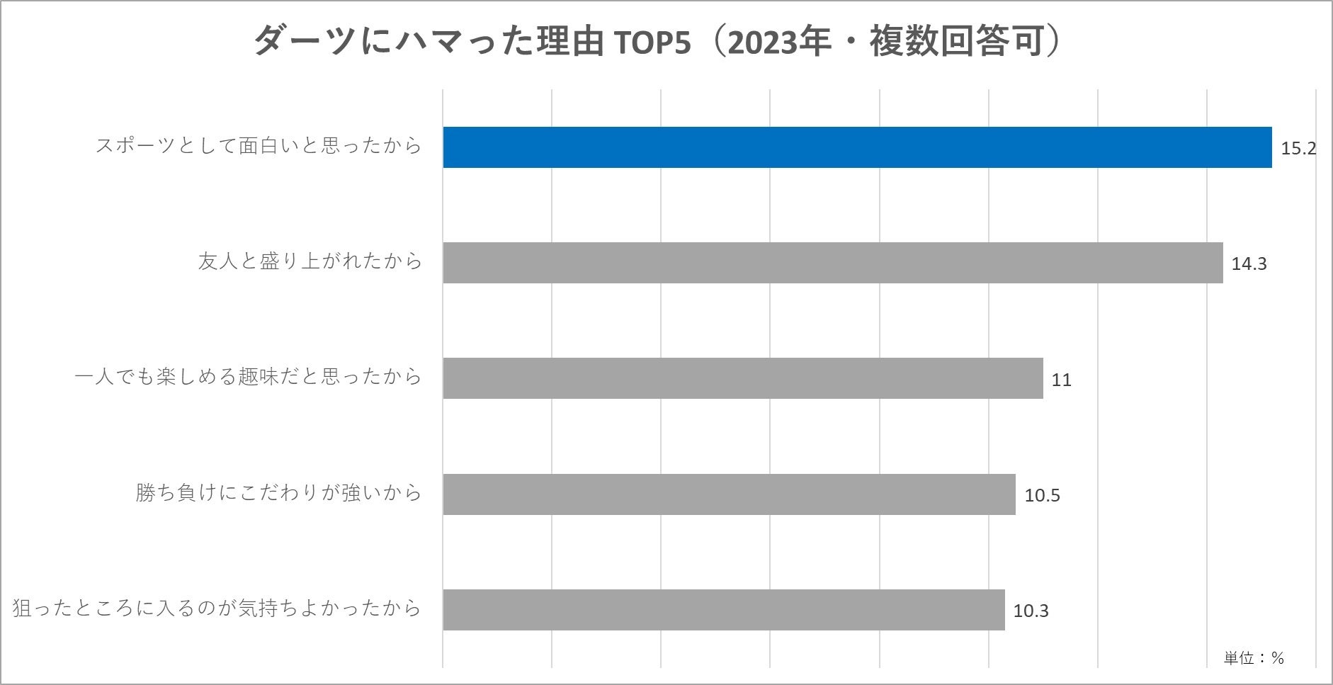 続いてダーツにハマった理由について注目すると「スポーツとして面白いと思ったから(15.2%)」が最多となり、2021年の第4位回答(※)から第1位回答へと順位を上げました。