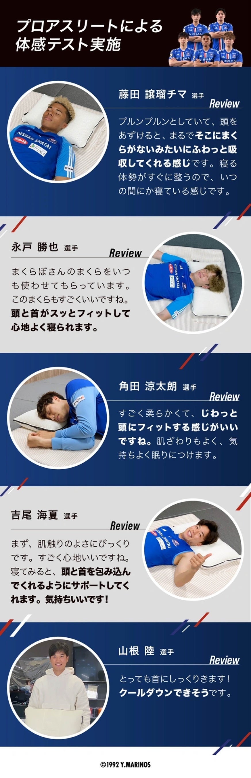 たくさんの皆さまから応援をいただいて好評発売中のこちらの枕ですが、まくらぼが公式睡眠アドバイザーを務める横浜F・マリノスの選手にも実際に体感していただきました。