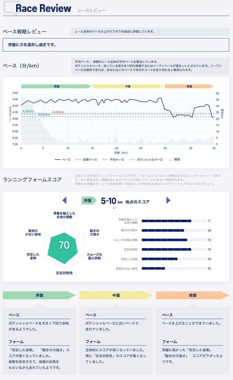 レース中のランニングフォームなどの計測データをもとに、一人ひとりのランナーにパーソナライズされた分析結果を提供するデジタルサービス「ASICS RACE REPORT」を展開