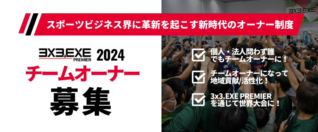 2014年に世界で初めて設立された「3×3.EXE PREMIER」では、チーム―オーナー制度を導入しています。リーグによる選手報酬の支払い、誘致権という大会運営システムの導入により、既存プロスポーツチームの持つ興行や運営に関するリスクを排除することで、チームオーナーはチーム活動(運営)に専念することができ、スポーツチームのオーナーとしてチームを保有し地域に密着しながらも、「セカイ」を目指せる新たなスポーツコンテンツを形成することが可能となっています。