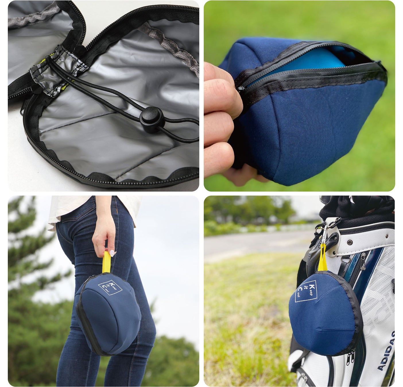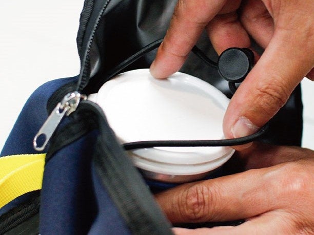 カバーの内側は防水加工の生地になっており、止水ファスナーを使用しているのでカバーを付けていれば氷のうから水が漏れても安心!結露対策にもなります。鞄にかけたり、手に持ちやすい黄色のフック付き。