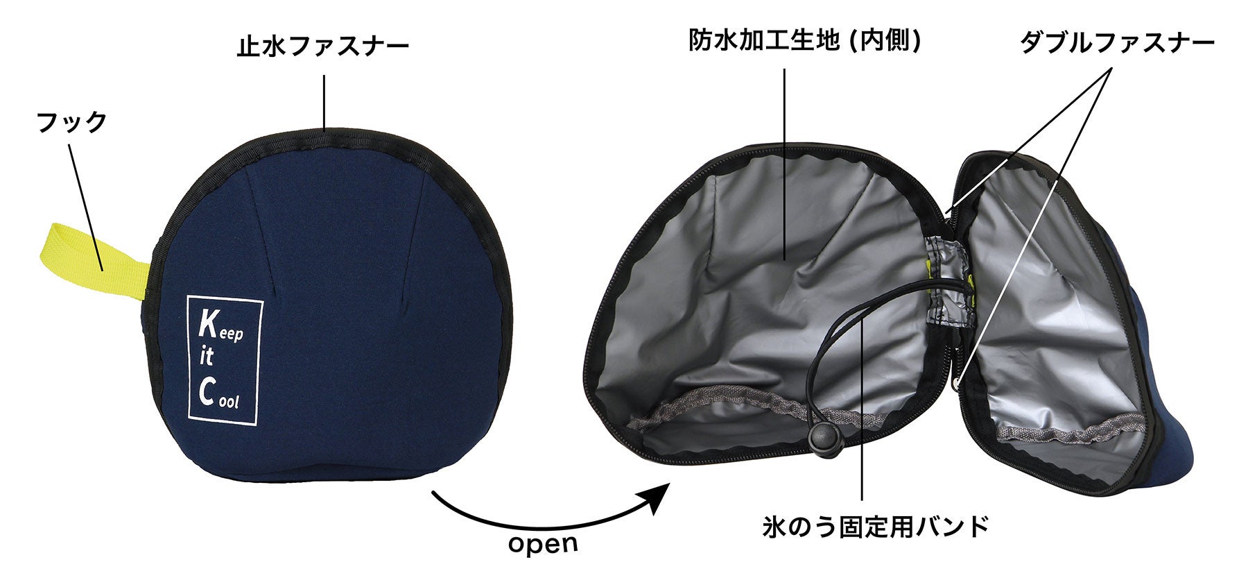 使い方は簡単。カバーの中に氷のうを入れて中のバンドで固定をするだけ。上下どちらからも開閉ができるダブルファスナーが付いているためそのまま氷を入れられ、カバーから出さなくても使うことができます。