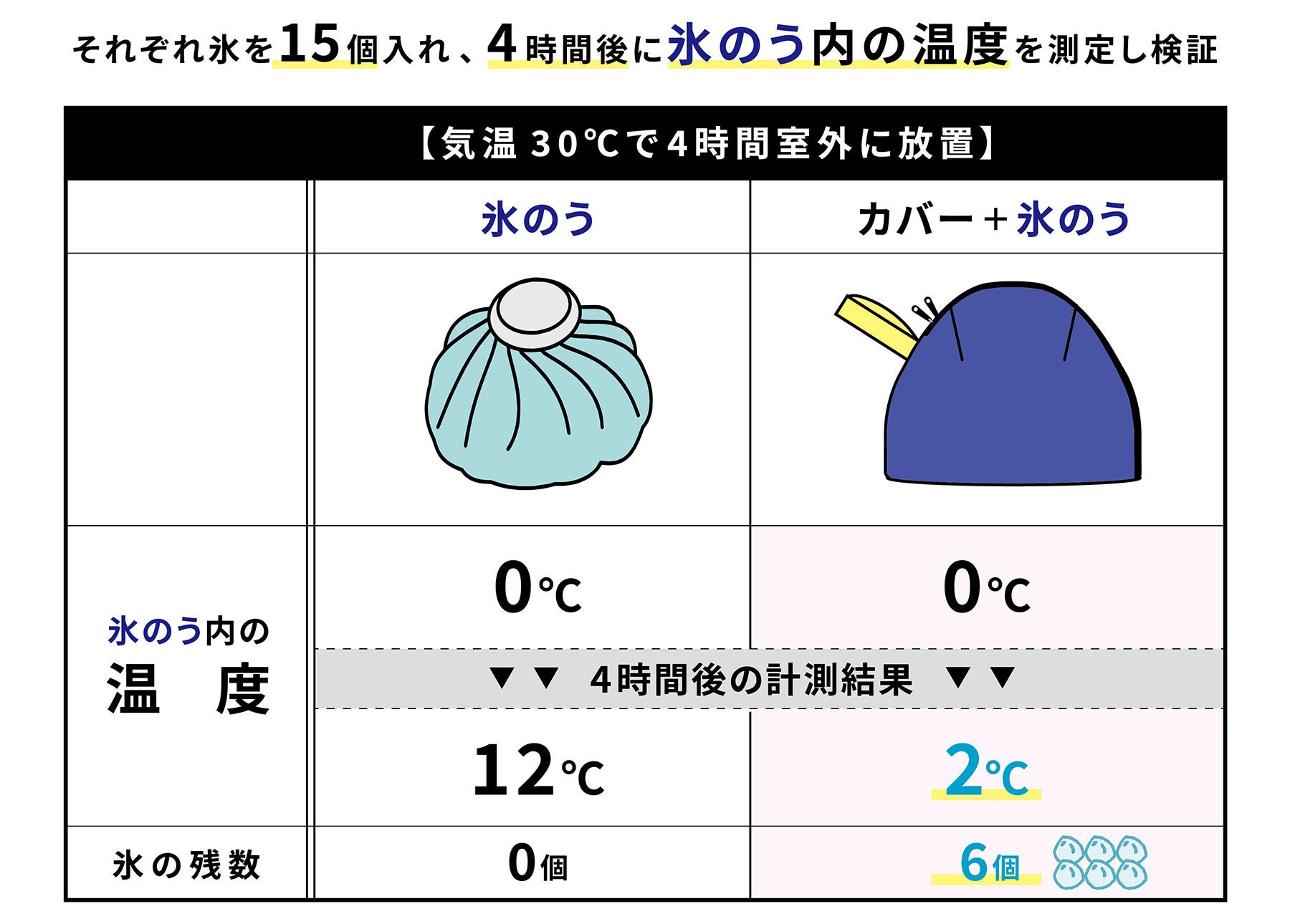 カバーありは氷のう内の温度が0℃ → 2℃に変化。氷は 6 個残り冷たい状態を保つことができた。