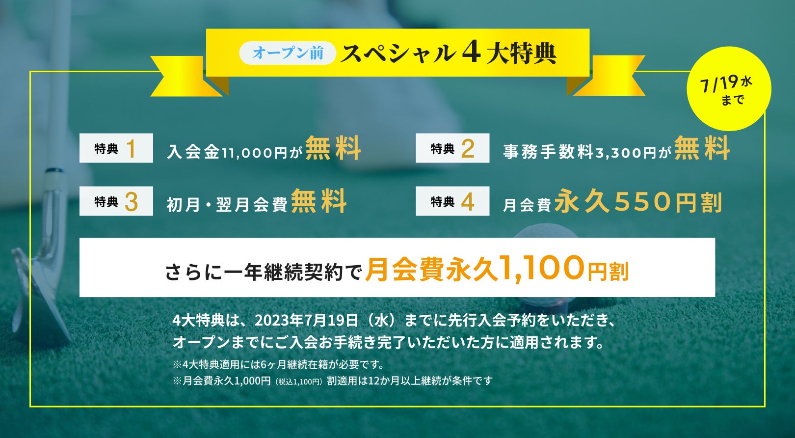 現在月会費永久割引など4大特典で入会できるお得なキャンペーン実施中。特典適用での入会をご希望の方はまずは無料先行入会予約(7/19まで)をお済ませの上詳細案内をお待ちください。
