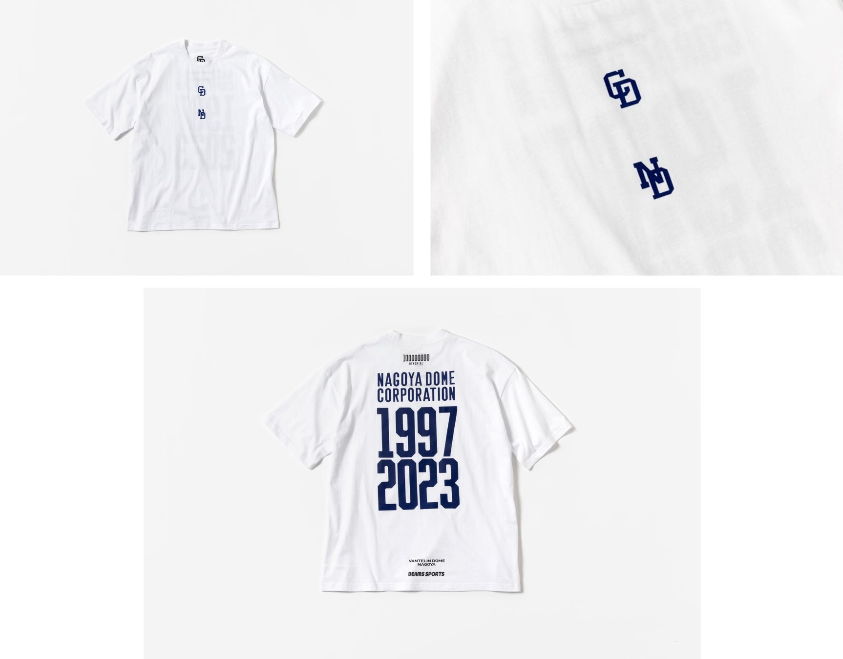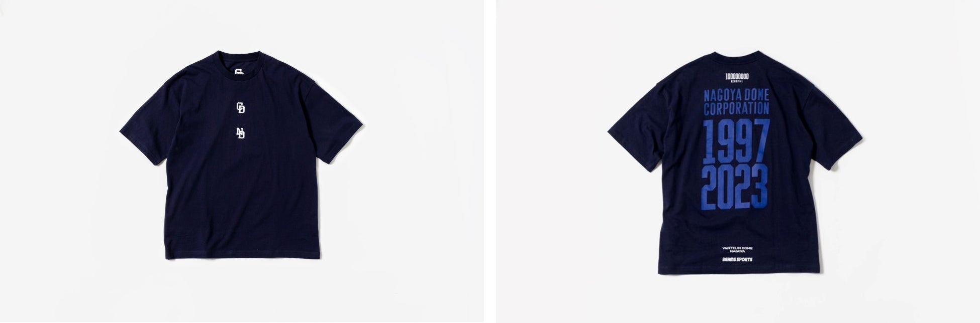 当日は、〈BEAMS SPORTS〉がプロデュースした当イベントの限定Tシャツを、来場者先着10,000名様にプレゼントします。ビッグシルエットの白いTシャツにドラゴンズブルーのカラーをプリント。フロント(前面)には、中日ドラゴンズの“CD”ロゴとあわせて、ナゴヤドームの“ND”ロゴを入れています。バック(背面)は開業年の1997、1億人達成の2023のメモリアルな数字をメインに構成し、野球のユニフォームのような、限定Tシャツをデザインしました。