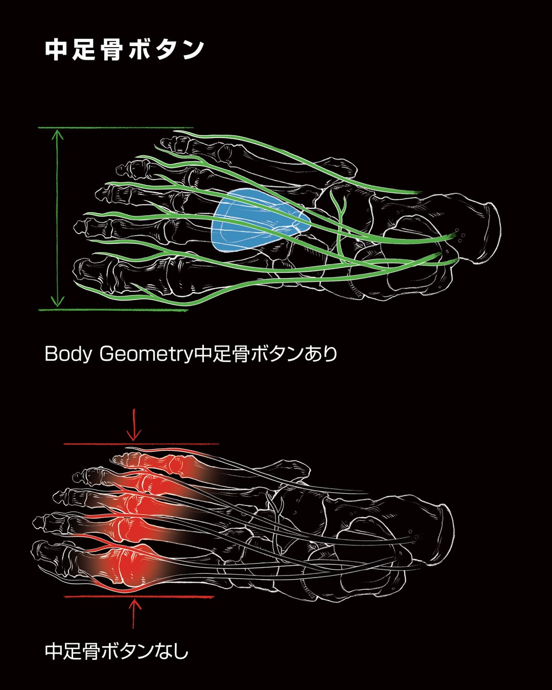 ペダリングパワーを引き出し、バイクとの一体感を生むためには、シューズを足にしっかりフィットさせなくてはなりません。一方で固定を強くすると、前足部の中足骨の間で神経や動脈が圧迫され、痺れや火照りが生じる場合があります。 そこで、シューズのインソールに中足骨ボタンを成形し、中足骨を持ち上げて分離させ、この問題を解消しています。