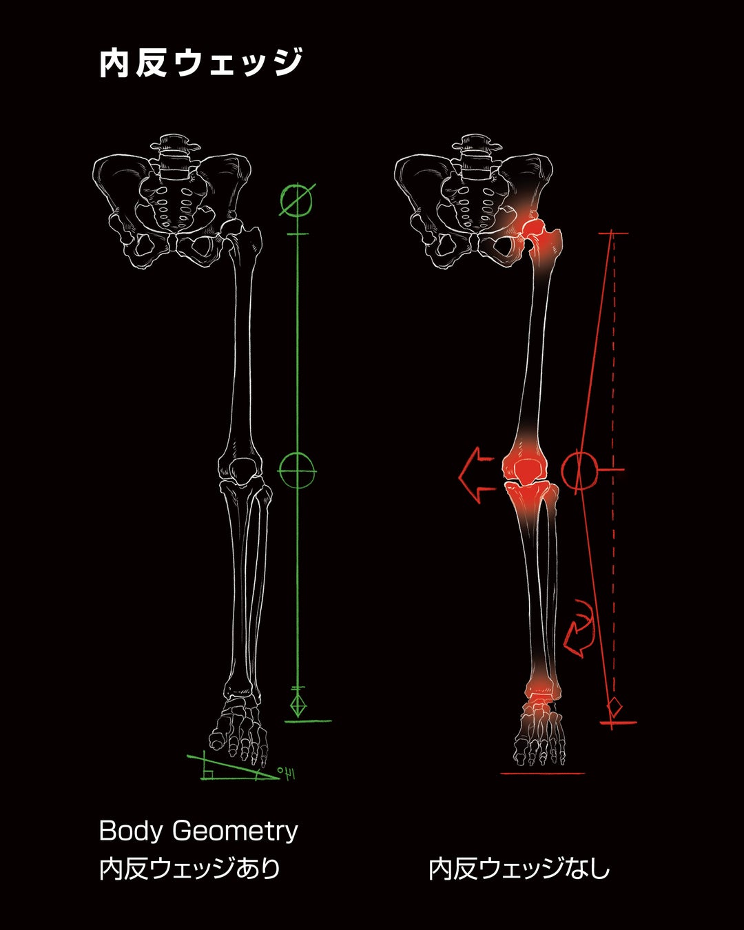 他のBody Geometry シューズと同じく、特許取得の内反ウェッジを備え、アウトソールを1.5mm外側に傾斜。これが足首、膝、股関節のアライメントを最適化し、ペダリング時の脚の動きを安定させます。