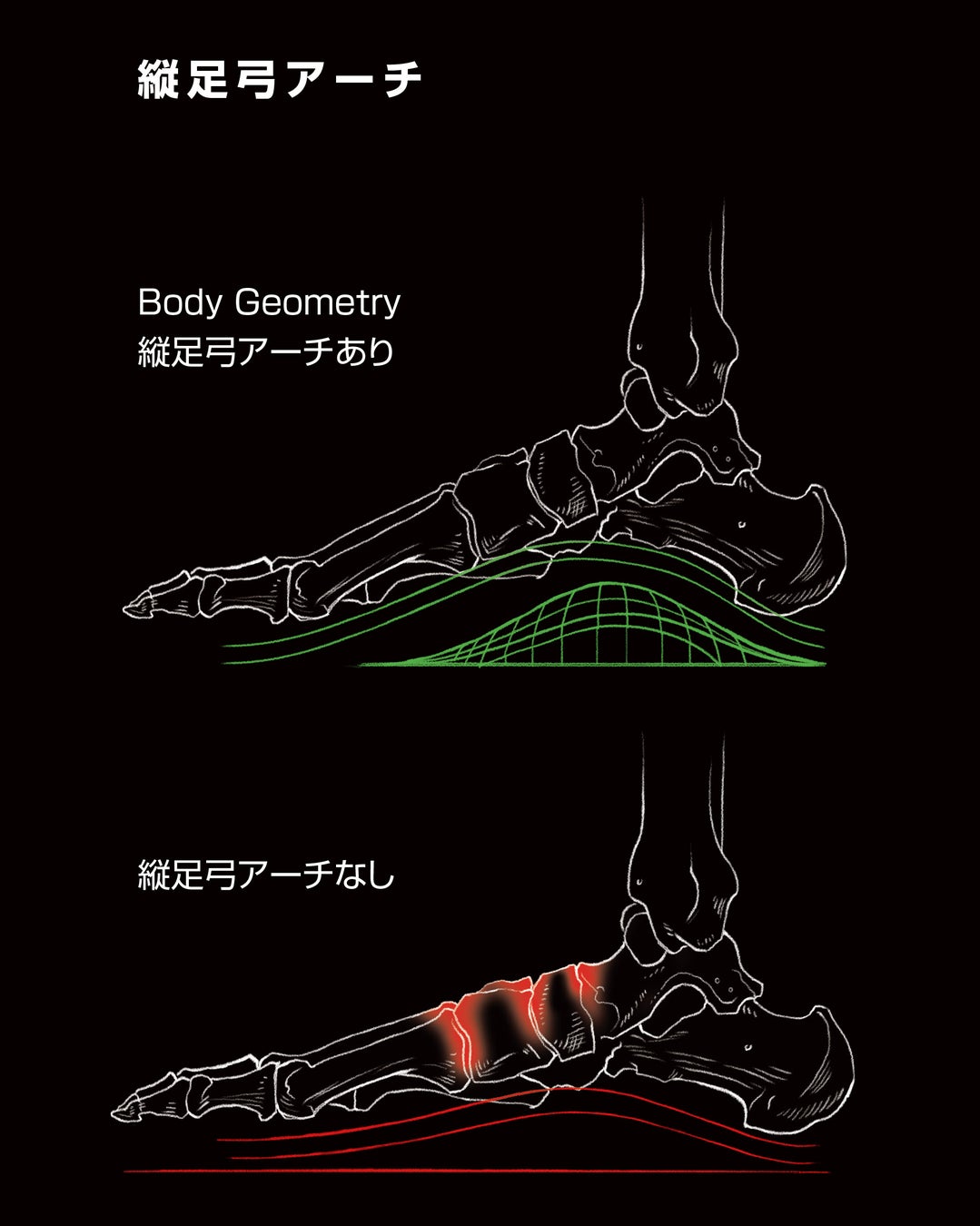 ペダルを漕ぐときは、足を硬いテコのように使い、力を直接、効率的にペダルに伝えたいもの。そのためにも土踏まずが潰れないよう、インソールに縦足弓のアーチサポートを組み込みました。Body Geometryシューズが登場する前のサイクリングシューズは、硬さこそあれインソールが平らで、シューズの中で土踏まずが潰れがちでした。私たちのカスタムフットベッドを使えば、土踏まずをより確実に支えられ、ライドを快適に楽しめるようになります。