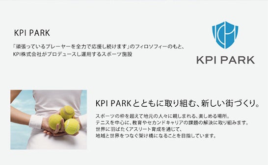 KPI PARKは「頑張っているプレーヤーを全力で応援し続けます」のフィロソフィーのもと、KPI株式会社がプロデュースし運用するスポーツ施設です。また、新しい街づくりの考えから「スポーツの枠を超えて地元の人々に親しまれる、楽しめる場所。テニスを中心に、教育やセカンドキャリアの課題の解決に取り組む。世界に羽ばたくアスリート教育を通じて、地域と世界をつなぐ架け橋を目指す」としています。
