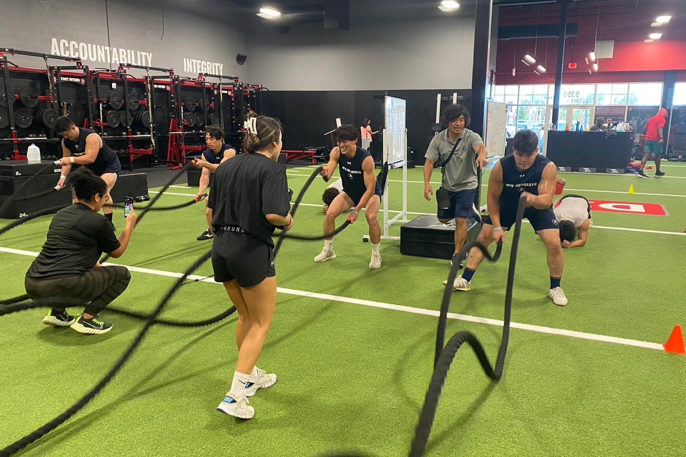 トレーニングを行った「 D1 トレーニング フォートマイヤーズ」(D1 Training Fort Myers )はNFLで活躍するWRのサミー・ワトキンス(Sammy Watkins)選手、元NFL選手のジェイレン・ワトキンス(Jaylen Watkins)氏、トレ・ボストン(Tre Boston)氏の3人がオーナーのジムです。ジムで、実際にジェイレン氏から直接指導を受けることができました。特に求められたのは「スピード」。重量を持てる強さだけでなく、それをアメリカンフットボールのプレーで発揮できるようにするコントロールとスピードを強化するメニューが行われました。日本で取り組んできたトレーニングとは違ったハードなメニューに、選手たちは疲労困憊ながらも互いに声を掛け合い、最後までやり遂げました。