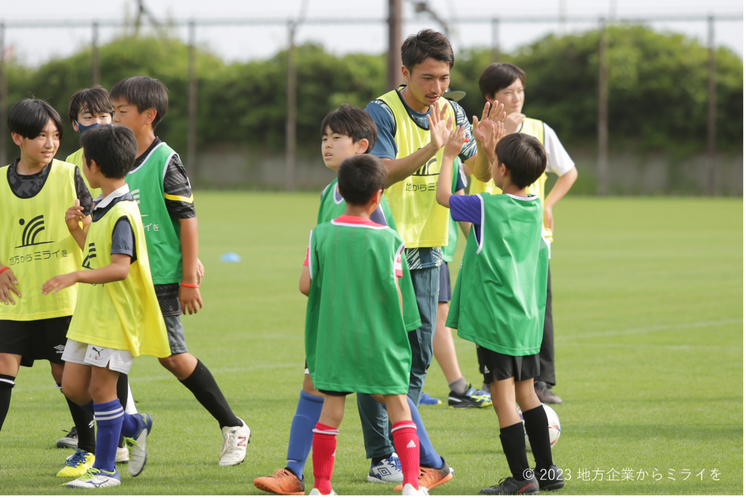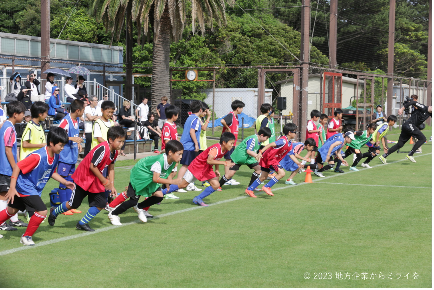 子どもたちとミニゲームなどで交流したほか、スタッフとともにボールタッチの練習や走り方教室、保護者を対象にしたストレッチ、体幹トレーニングなどを実施いたしました。