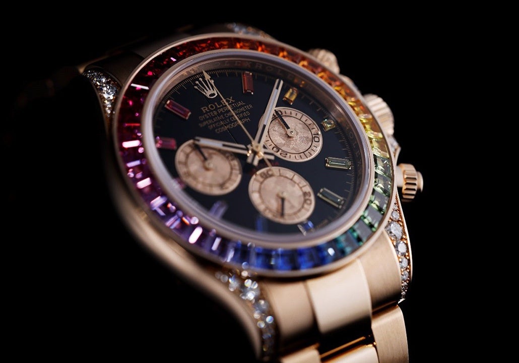 2012年に誕生した「レインボー」。最初のモデルは18Kホワイトゴールドとイエローゴールド製で展開され、ベゼルに鮮やかなサファイアを配したモデルとして人気を博しました。しかしロレックスの高い基準に見合う品質の石の調達が難しく、2017年に一度生産終了となりました。今回出品されるのは2018年のバーゼルワールドで復活した「レインボー」の新しいモデル。ロレックス独自のエバーローズゴールドを採用し、ベゼルにセットされた36個のマルチカラーのバゲットカットサファイアが虹色のグラデーションを作り上げています。5年前に発表されて以来、話題のモデルして、プロスポーツ選手、時計コレクター、ファッション業界の第一人者、ミュージシャンなど、多くの著名人の手元を彩ってきました。一方で生産数は極めて少なく、ロレックスの長年の顧客であっても通常の小売店で入手することはほぼ不可能であり、他のレアモデルと一線を画す非常に希少な一本です。