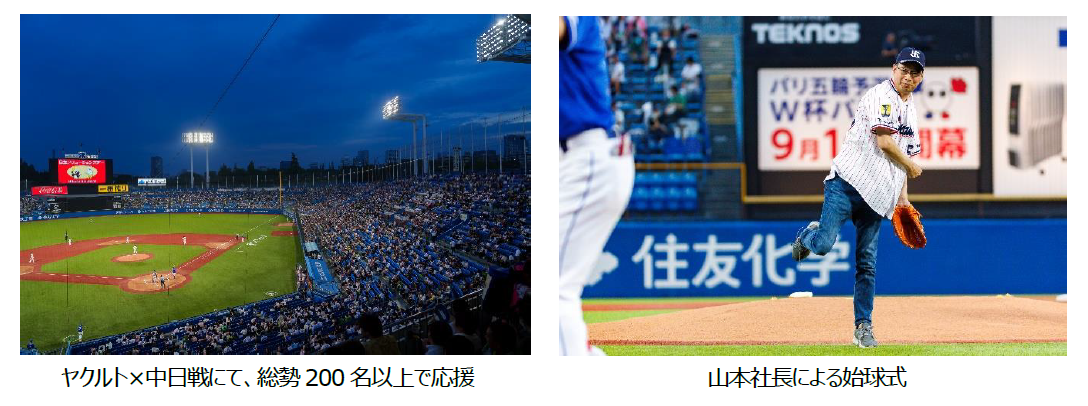 そして、お客さまやパートナー企業、社員向けには、山本社長による始球式や日立ソフトボール部「日立サンディーバ」に所属する社員による選手への花束贈呈式を実施しました。子どもたち向けには、選手と入場するエスコートキッズやグラウンドでの応援など、さまざまな観客の皆さまに楽しんでもらえるイベントをめざしました。