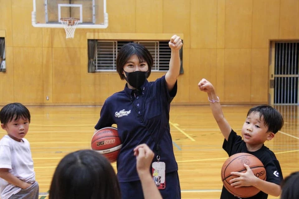 参加者の皆さまには、嶋田コーチによるバスケットのスペース判断やドリブル、パスといった基礎スキルのトレーニングを高学年(小学5年生~高校1年生)対象に行い、平サポートスタッフ/原田マネージャーによるボールと触れ合い、体を動かし友達とのコミュニケーションを育む内容を低学年(幼児~小学4年生)対象に実施し、バスケットボールクリニックを楽しんでいただくことができました。
