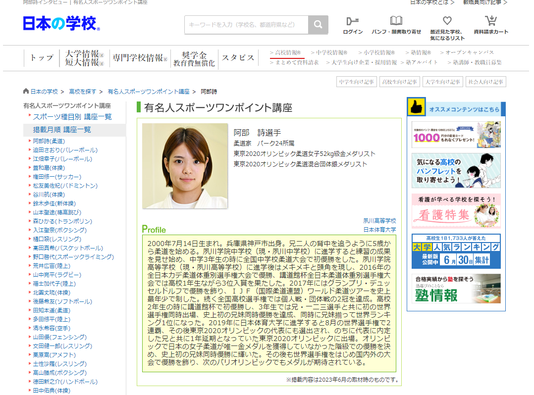 全国の大学・短大・専門学校などの学校情報を提供する、株式会社JSコーポレーション「⽇本の学校」では、注目のプロアスリート選⼿の学⽣時代の取り組みや、練習⽅法・⼼構えに関するアドバイスの他、⾼校⽣に向けた熱い応援メッセージを掲載しています。