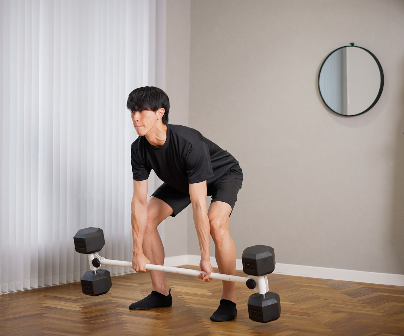 (写真上)KENSUI kaku(¥39,600)はKENSUI dips(¥16,500)を拡張して使用できます(写真下)KOMBOバーベル(¥12,980)は片方45kgずつ、合計90kgまでのダンベルが取り付け可能です。いずれも税込表記です