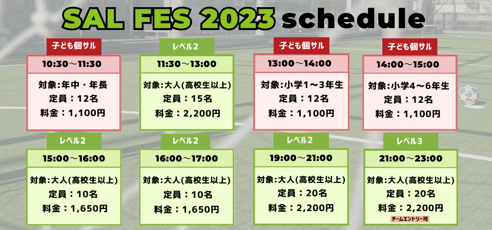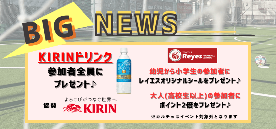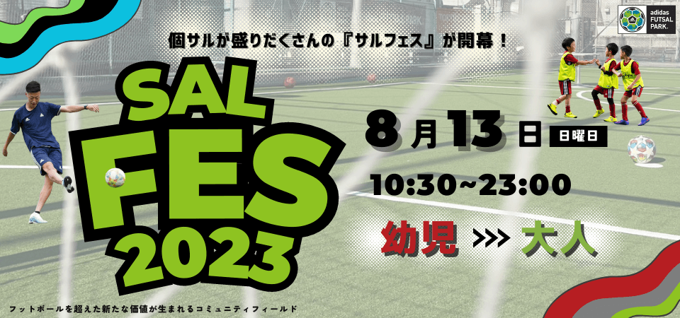 東急Sレイエス フットボールスクール池袋が活動するアディダスフットサルパーク池袋では、1日中様々な年代が個サルを楽しめるよう『SAL FES 2023』を実施いたします。今回はKIRIN様よりプラズマスポーツのドリンクをご協賛いただいております。ぜひこの暑い夏を、熱い個サルで乗り越えましょう!皆様のご参加をお待ちしております。