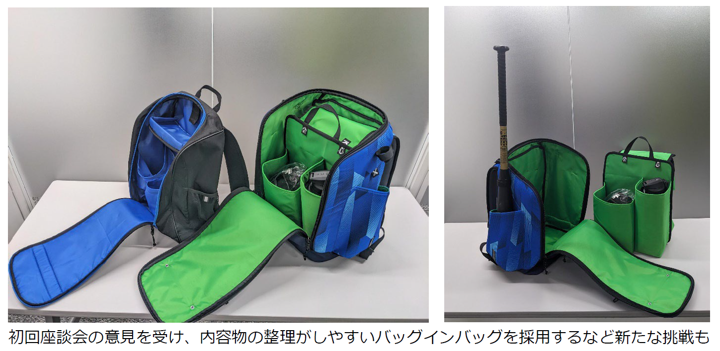 フィードバック座談会では、初回の商品開発座談会で『野球チームに所属している子どもを持つ保護者』からヒアリングしたご意見を踏まえ、オリジナルバッグの試作品を開発したエスエスケイの商品開発チームと、初回座談会にご参加いただいた保護者の皆様に再度お集まりいただき、出来上がった試作品に関する意見交換とフィードバックを行いました。