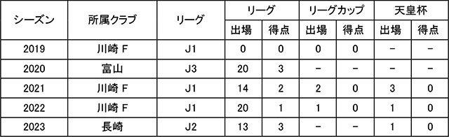 所属歴/川崎フロンターレU-12 – 川崎フロンターレU-15 – 川崎フロンターレU-18 – 川崎フロンターレ – カターレ富山(期限付き移籍) – 川崎フロンターレ – V・ファーレン長崎(期限付き移籍)