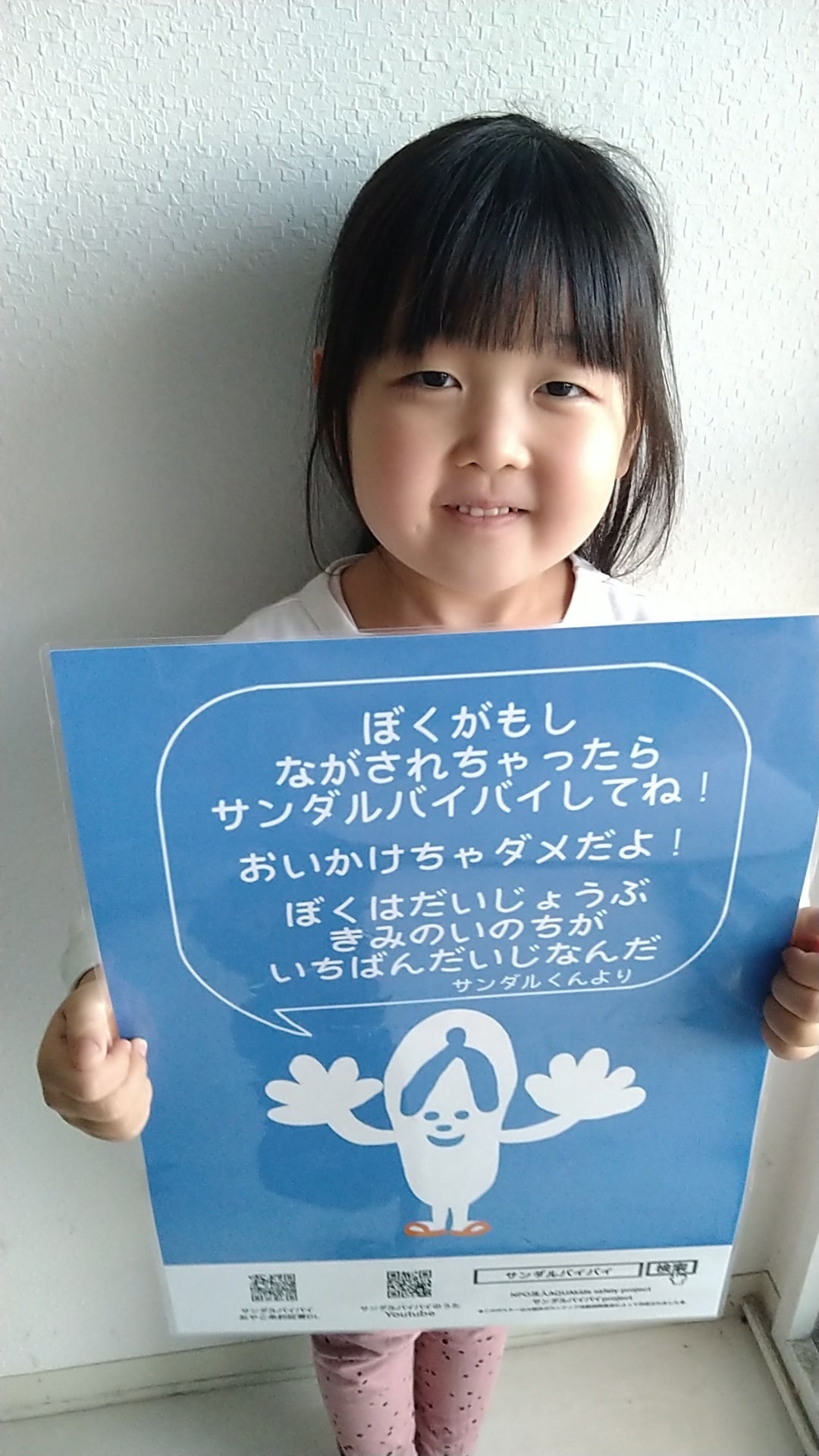 流されたサンダルなどを追いかけて溺れる水難事故を予防するキーワード。(流されたサンダルなどを追いかけて溺れる水難事故は6年連続で発生しています。当法人調べ。)サンダルは買えても、命は買えません。「流されたサンダルはバイバイしよう」サンダルバイバイには、これまでTwitter上で3000以上のいいね!がつき、関連動画再生回数は10万回以上で、現在も更新中です。「流されたモノは追いかけない」という事故予防のアクションに、直接繋がりやすいキーワードとして、NHK Eテレや新聞でも取り上げられ、公立小学校の教材としても活用されています。