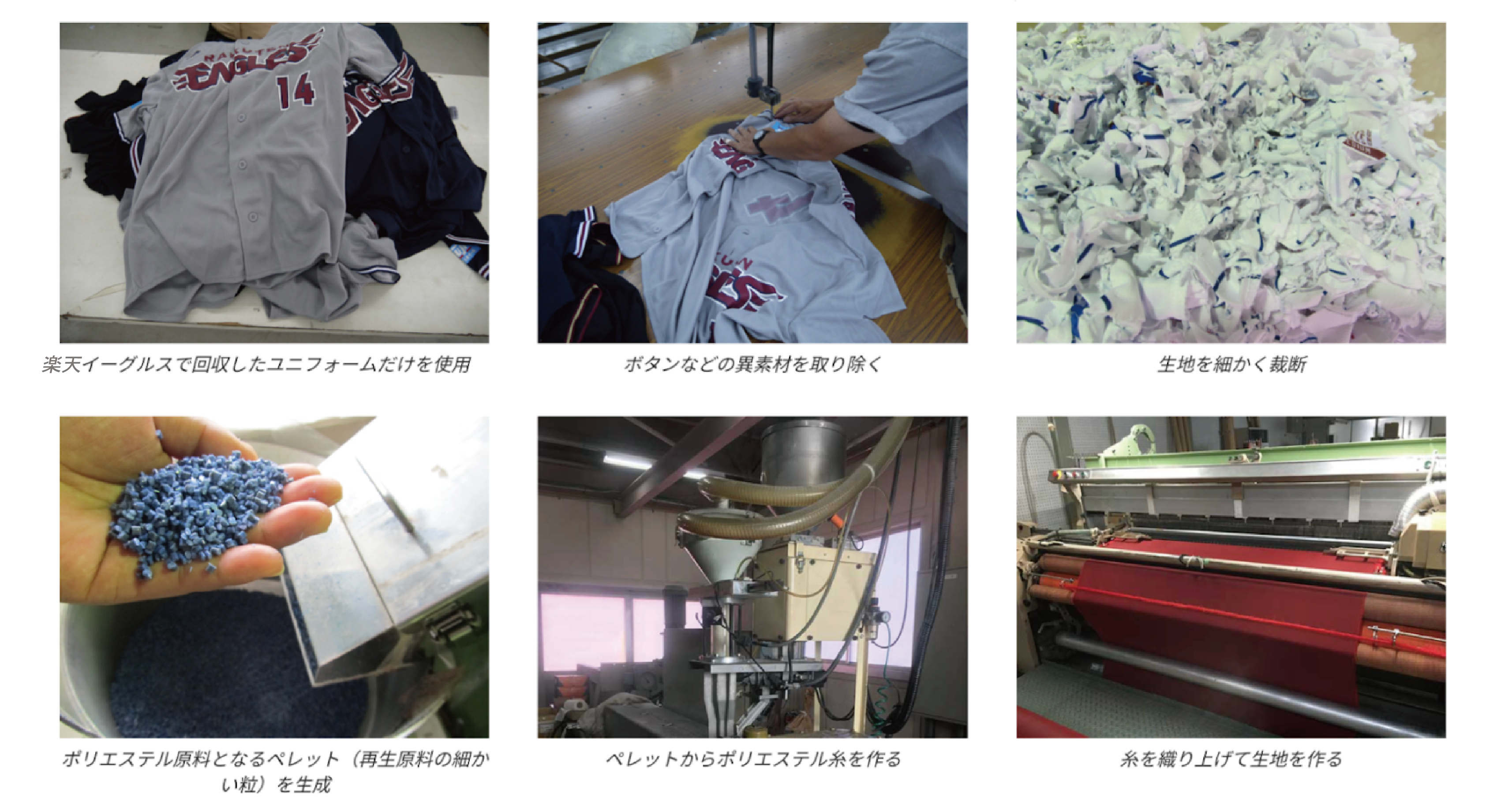 過去にはユニフォームリサイクルプロジェクトにてマテリアルリサイクルの技術を提供。合計7,315枚のユニフォームから楽天イーグルスオリジナルのリサイクルエコバッグを制作。