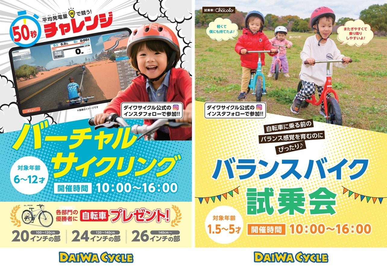 ダイワサイクルのブースでは、米国発のバーチャルサイクリングアプリ「ZWIFT」を使用した発電量レース(対象年齢:6歳~12歳)と当社オリジナル商品である超軽量バランスバイク「チョコロ」 (対象年齢:1歳半~5歳)の試乗体験会を実施いたします。