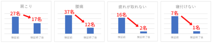 対象者に機能性シャツを着用してもらい、着用前・後の変化を計測しました。岡山県新庄村との実証実験では、2週間着用後に症状が改善されたという方が、肩こりで77%、ひざ痛で100%、肩こりで35%と高い効果を発揮しています。