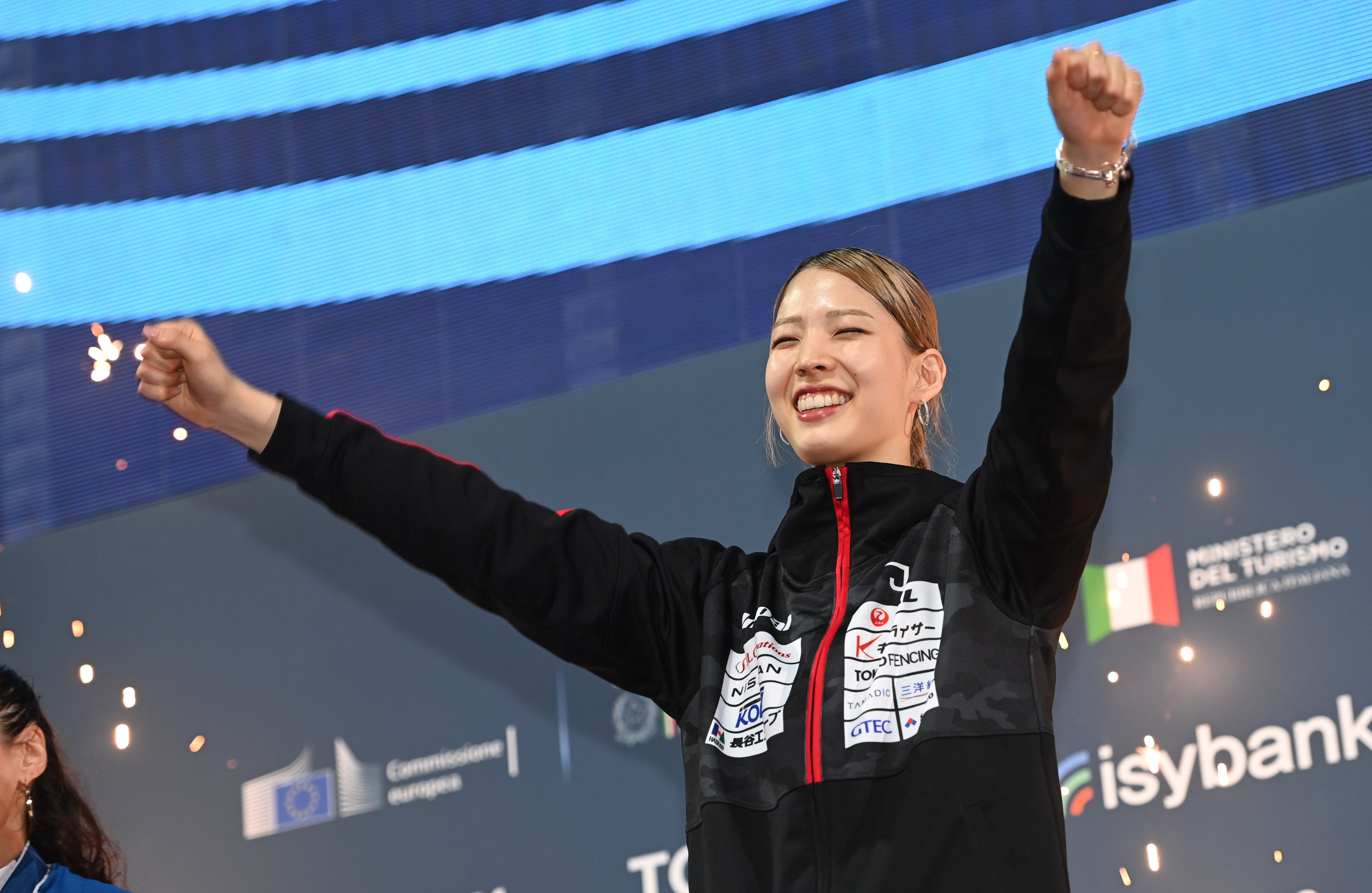 今大会を世界ランク1位で迎えた江村は、準々決勝でCRISCIO(ITA)を15対8、準決勝では世界ランク3位のGKOUNTOURA(GRE)に15対14で競り勝ち、決勝では世界ランク4位のGEORGIADOU(GRE)を15対11で制し、見事二連覇を達成しました。