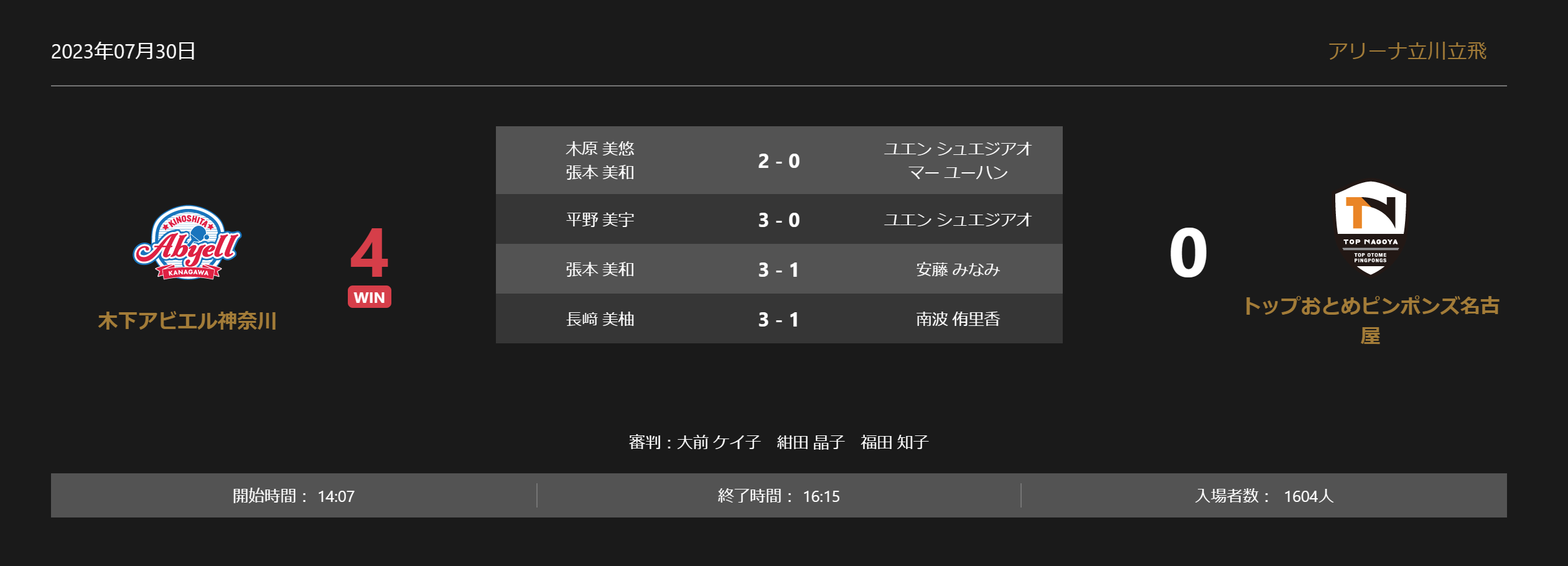 木下アビエル神奈川vsトップおとめピンポンズ名古屋の試合は4-0で木下アビエル神奈川が勝利しました。