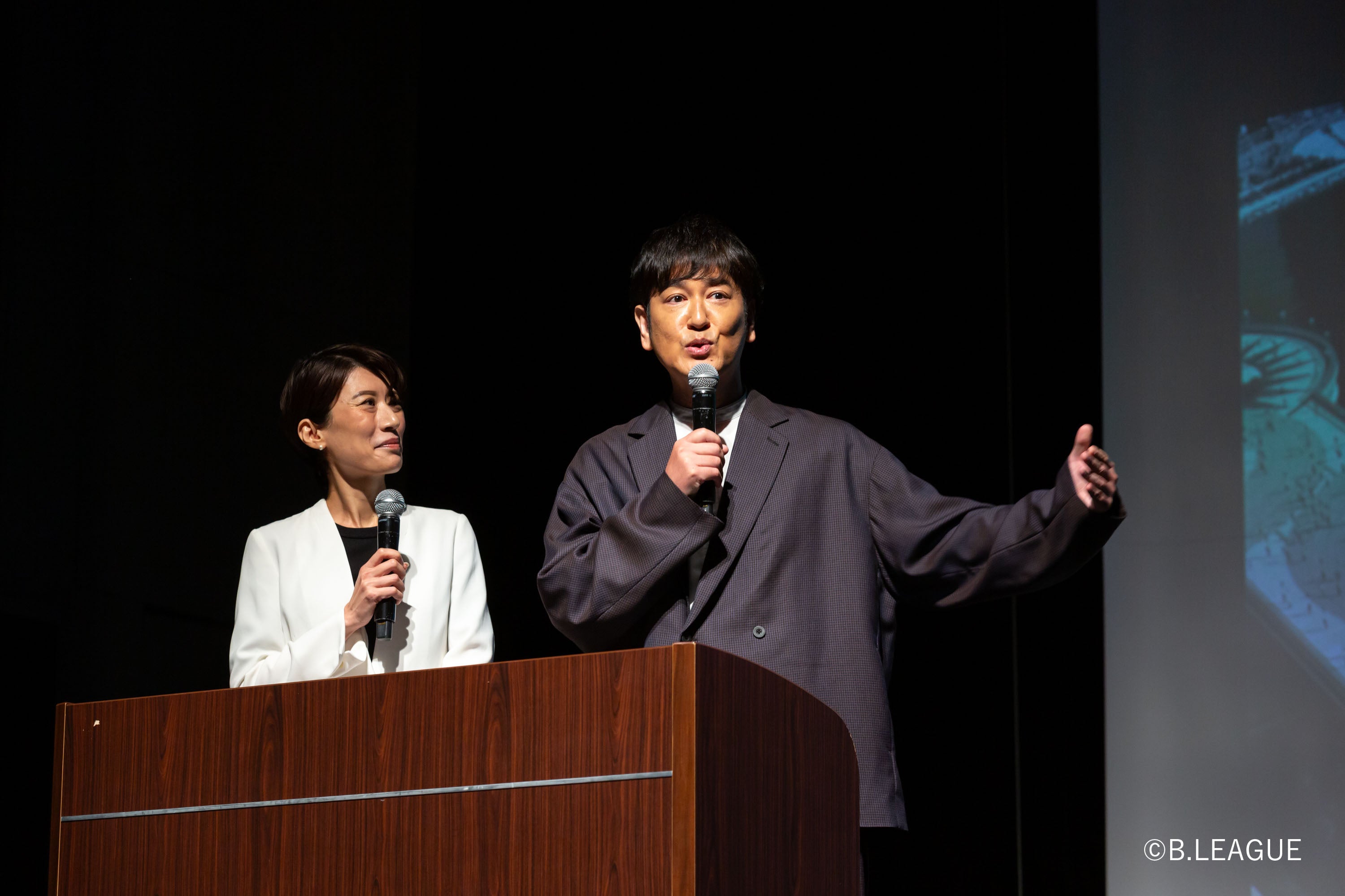 今回、熱烈なバスケットボールファンで、以前B.LEAGUEに関する情報番組のMCも担当された熱烈応援団のココリコ田中さんがメイン司会進行を担当。B.LEAGUEチェアマン島田慎二が登場し、集まった報道関係者に向けて、B.LEAGUE将来構想についてプレゼンテーションを行いました。