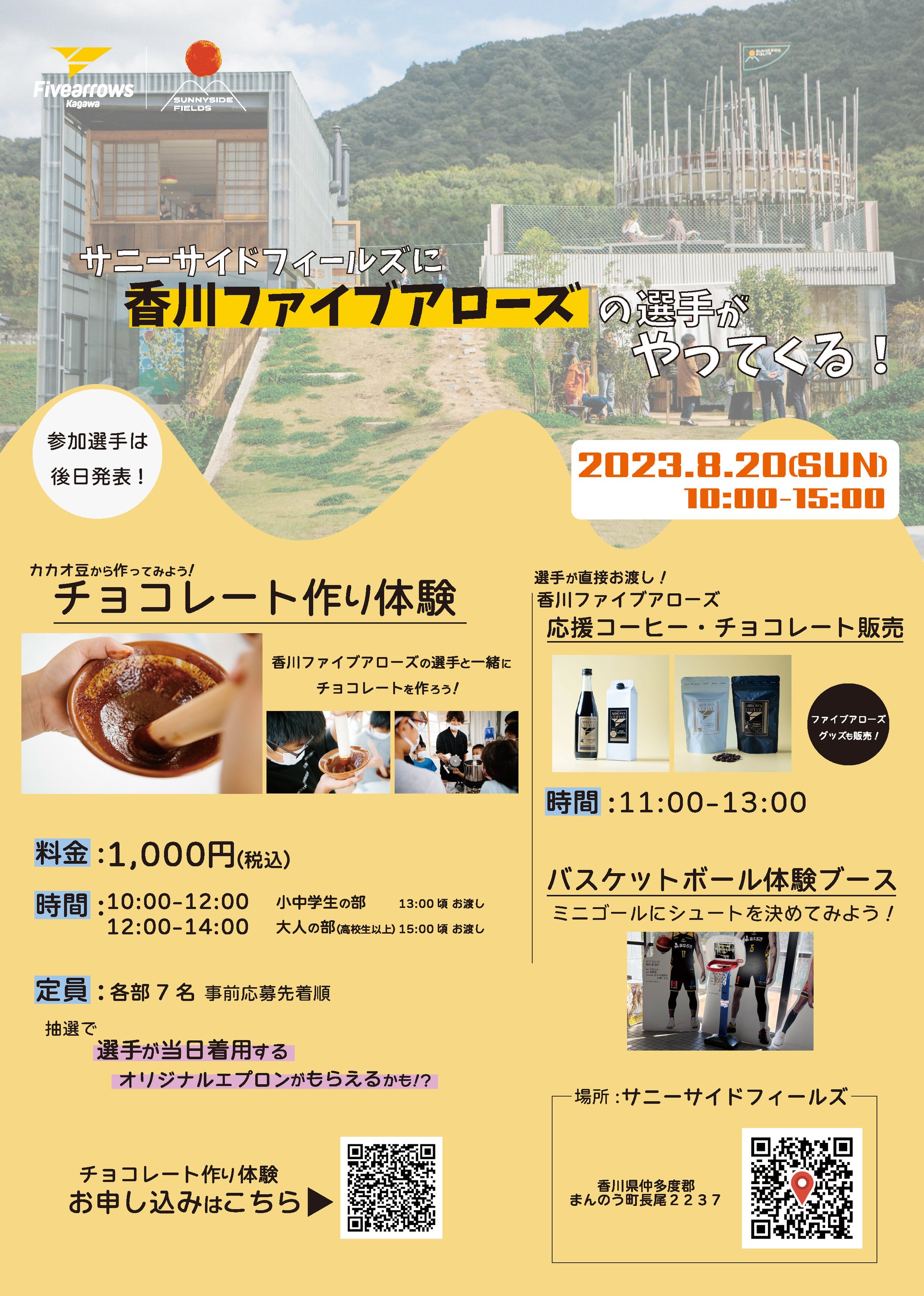香川ファイブアローズ応援ショコラバーを製造するサニーサイドフィールズでチョコレート作りを体験できます!夏休みも終盤、選手と一緒にチョコ作りをして夏の思い出を作ろう!