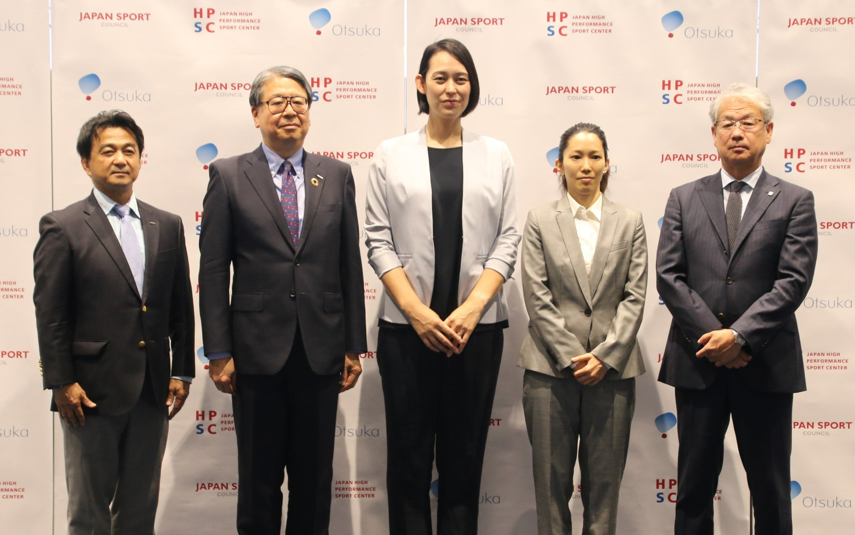 左より、JSC理事 久木留毅, JSC理事長 芦立訓, ゲスト 大山加奈, ゲスト 木下まどか , 大塚製薬常務執行役員 佐藤真至