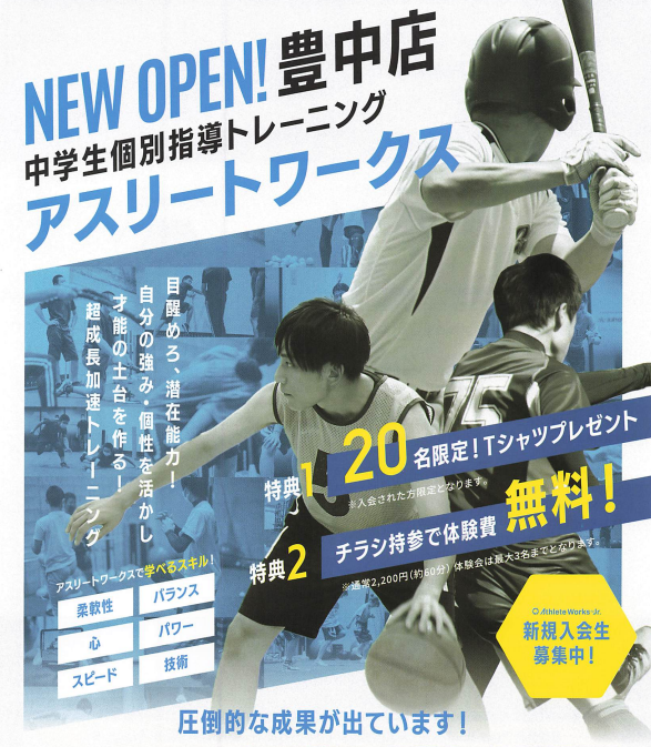 現在、新規入会生を募集中で、気軽に見学・体験いただける機会を設けています。基礎的な身体の土台作りや運動神経を整えたいお子様や、ジュニアアスリートを目指す選手。そしてその保護者様から高い評価をいただいているアスリートワークスのトレーニングをぜひご自身で体験してみてください。