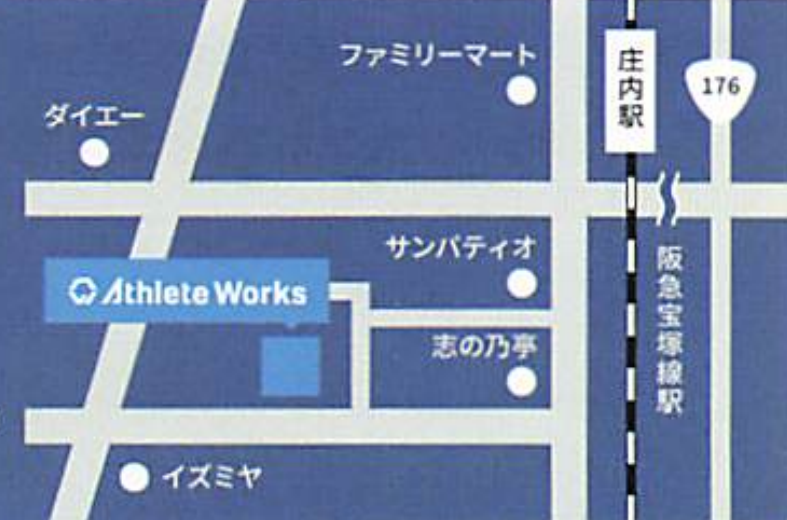 アスリートワークス豊中店は、阪急宝塚線「庄内駅」西出口から南へ約100m、西本町商店街の中にあります。同じビルの1Fに店舗を構える「ふじくら鍼灸整骨院様」とは、ジュニアアスリート育成(次代を担う子どもたちの健康とスポーツをする子どもたちの育成を支援する取り組み)で相互連携させていただいています。そのため潜在能力を引き出す体づくりに加え、日々の体のメンテナンスやコンディショニングを含めたサポート体制が整っていることが豊中店の特徴です。