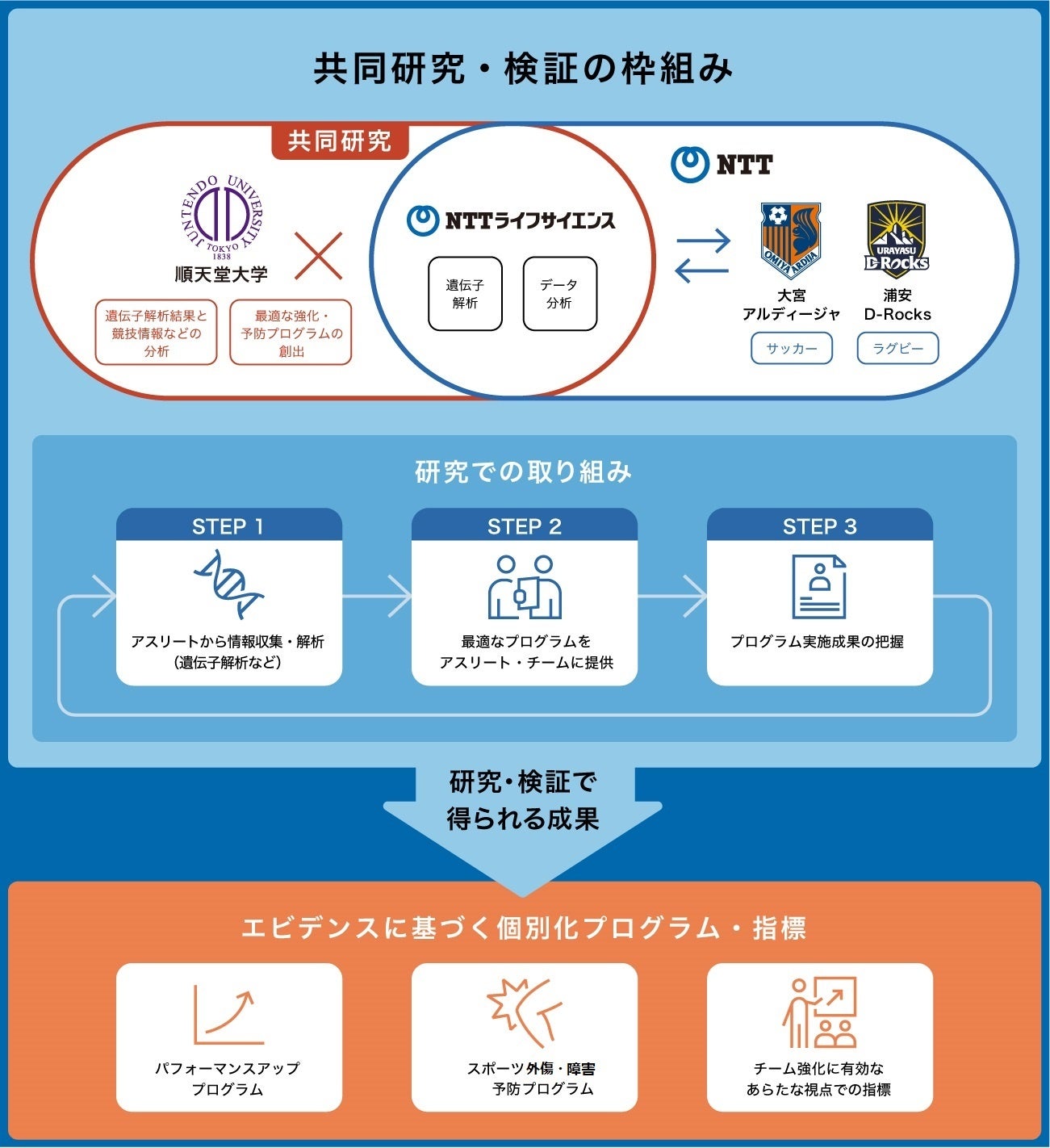 NTTグループ所属のプロスポーツチーム、大宮アルディージャ・大宮アルディージャVENTUS、浦安D-Rocksでの遺伝子解析、個別化プログラム検証、データ分析を担当。NTTはグループが有するIoT、AI等の情報通信技術や画像解析技術などをもとに、選手及びチームに対して日々のトレーニングやチーム練習、試合での分析に役立つツールなどを提供予定。更に、スポーツ界への本研究成果の幅広い展開及び貢献をめざし、NTTグループ各社のアセットを活用し、社会実装の検討を実施。