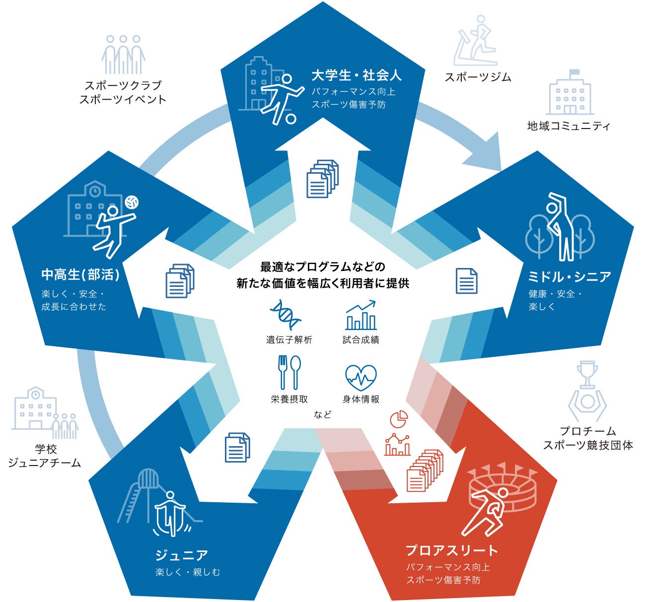 本共同研究は、アスリートのスポーツに関連する遺伝子解析結果を、チームやアスリート個人が活用する情報(試合や練習中の歩数、食事などの生活習慣、健康診断結果、動作解析用の画像データなど)に加え、網羅的に分析を行う予定です。この分析結果と考察から導き出したトレーニングメニューを選手やチームに提供、一定期間活用したときの効果を検証します。