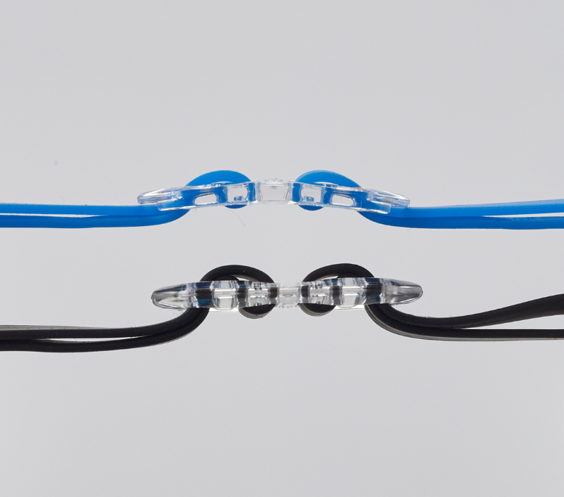 左右のレンズをつなぐノーズベルトの取付部を四角から丸形形状にすることで、ノーズベルトとレンズが固定されずフレキシブルに動くようになり、より顔の形に沿ってフィットしやすくなりました。