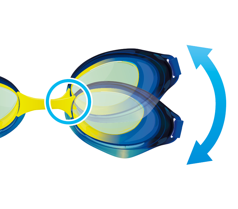レンズ面に、上部にむかって厚みを抑える傾斜をつけ、瞬きしてもまつ毛がぶつからないよう目の周りの空間は確保しつつレンズ上部の厚みを従来品(SWIFT)から約7%カット。また、レンズ上部が薄くなることで、泳いでいるときの前方への視野が広がりました(視野角が約38%向上)。