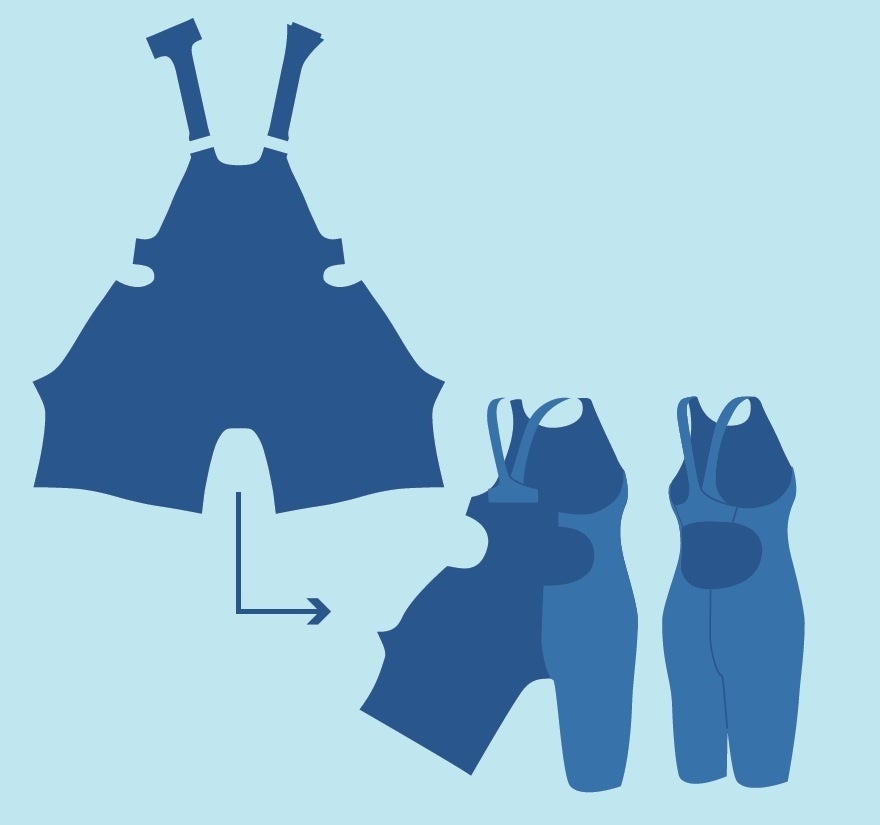 身頃を1パーツで構成し、縫製はお尻から股にかけてのラインのみなので、泳ぐ動きにあわせた生地の伸びを縫い目で止めてしまうことがありません。また水を含んでしまう糸の使用量を減らすことで水着の軽量化にもつながります。