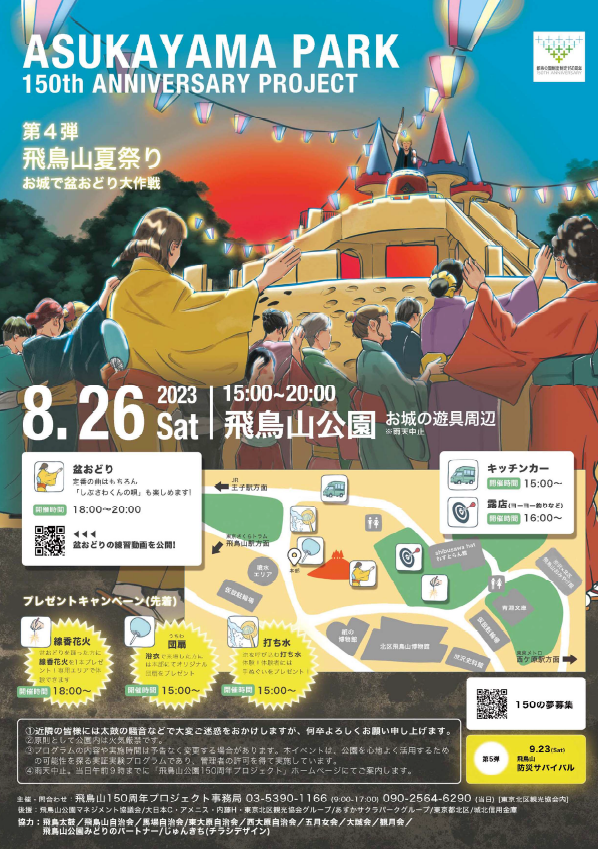 プロジェクトの第4弾として、8月26日(土)に飛鳥山公園で、飛鳥山公園150周年プロジェクトを開催します。本プロジェクトでは年間を通じて飛鳥山公園の魅力を区内外にアピールすると共に、様々な試みに挑戦することで、これからの飛鳥山公園を考えるきっかけとなるイベント等を行っていきます。第4弾のイベントでは、飛鳥山夏祭りとして遊具を櫓に見立てた飛鳥山公園ならではの盆おどりを行います。参加は無料、事前予約不要、雨天・荒天の場合は中止となります。