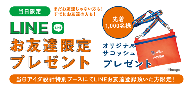 当日は、アイダ設計プレゼンツマッチを記念してアイダ設計公式LINE@にお友達登録している方先着1,000名様を対象に、アイダ設計×大宮アルディージャオリジナルコラボデザインのサコッシュをプレゼントいたします。さらに大宮アルディージャへの熱い応援メッセージの投稿で、サイン入り公式試合球が当たるInstagramキャンペーンも実施いたします。