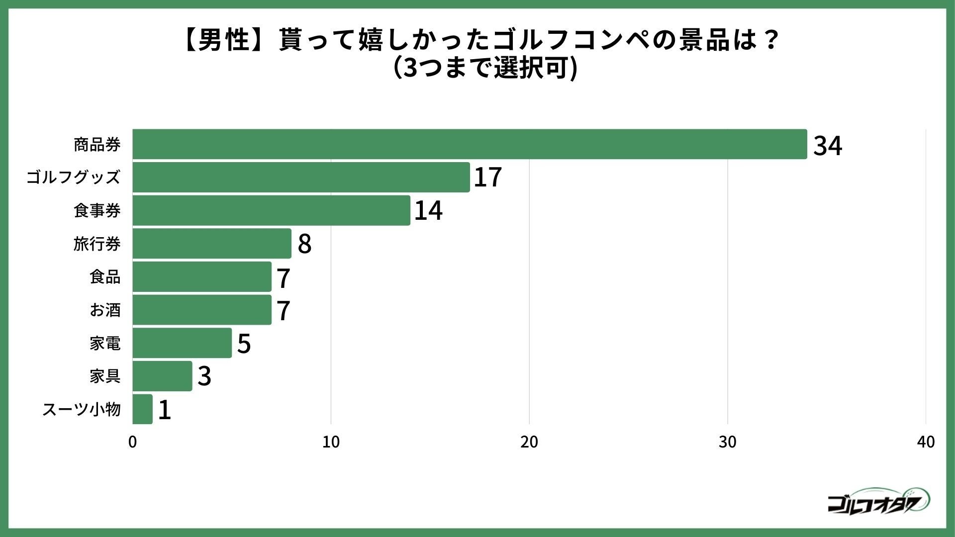 男性で貰って嬉しかったゴルフコンペの景品は「商品券」が34票で1位。2位、3位には「ゴルフグッズ」(17票)、「食事券」(14票)がランクインしました。